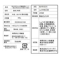 ●あか牛のたれ:しょうゆ(国内製造)、砂糖、米発酵調味料、赤酒、食塩/アルコール、調味料(アミノ酸等)、カラメル色素、甘味料(甘草)、(一部に大豆・小麦を含む)