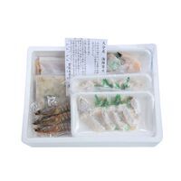 ■規格:ブリ切身100g、真鯛切身100g、車海老×3尾、はも切身100g、はもすり身100g、和風スープ250g×1