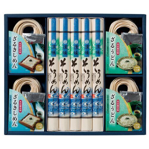 ■規格:ざるうどん (うどん90g、めんつゆ25g )×2、そうめん180g×5、ざるきしめん (きしめん90g、めんつゆ25g )×2