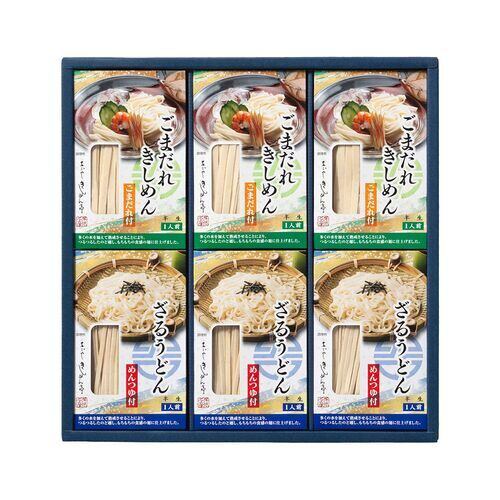もちもちとした食感が自慢の半生めん。さっぱりとしたごまだれつけ汁付「ごまだれきしめん」、かつお・昆布のだしの効いためんつゆ付「ざるうどん」の詰合せです。